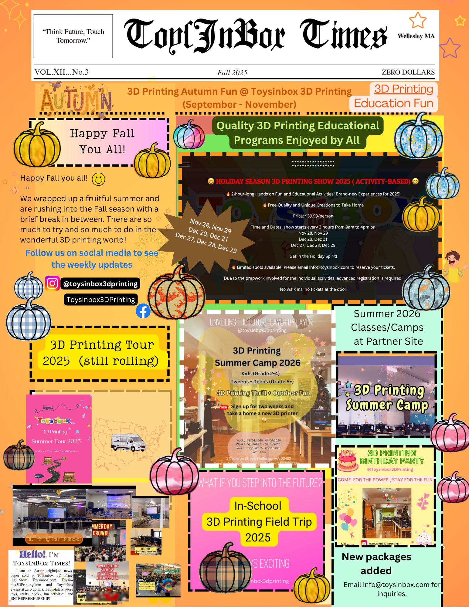 Think Future!|3D Printing & 3D Modeling| |3D Scanning & 3D Photo Booth| Workshops & Classes| Professinal Training| Student Camps| 3D Printing Show| 3D Printing Books| Kids Club| Parties| Events| |Toysinbox Times Fall 2025 Issue| Previous Issues|